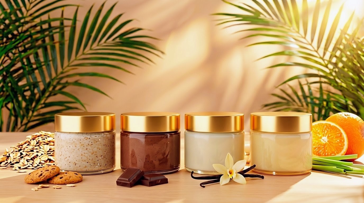 "Indulge in our mini butter sample pack, featuring our Silk Vanilla, Oatmeal Creme, Citrus Calm, and Hot Coco Oil Mask creams. With real chocolate and the same soothing ingredients as our oils, this cream deeply massages and melts into your skin for ultimate relaxation. Pamper your hard working hands and feet with this creamy delight."